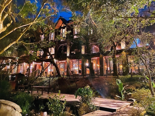經過了古堡之後,就會看到景觀餐廳的建築物本身,外觀是利用灰色石頭堆砌起來的石牆?上面還攀滿了藤蔓與樹葉,就像是在山林裡的糖果屋那樣,有種與世隔絕的氣息~