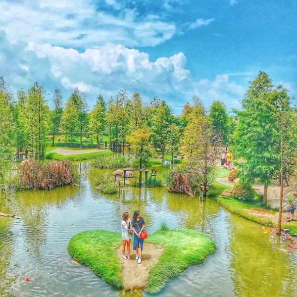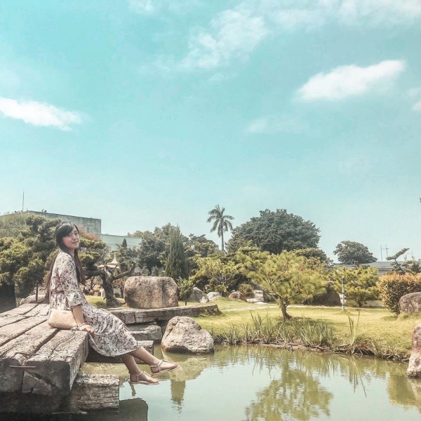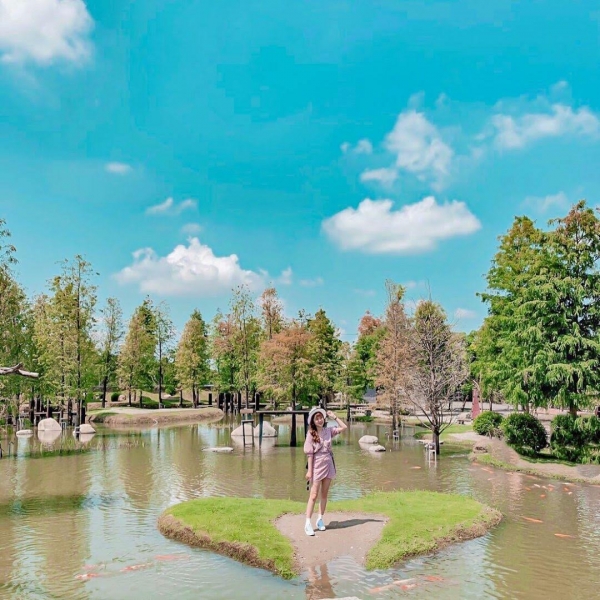 而最出名的就是這個日式生態池,裡面有大量的錦鯉與浮在水面上的小土地,又以中間這顆愛心地最出名,這裡可是最搶手的熱門打卡點,來到這裡可以看到很多人都在排隊一來這裡拍照,但小編覺得旁邊的造景橋也很美呀~應該是這裡怎麼樣超美的啦!