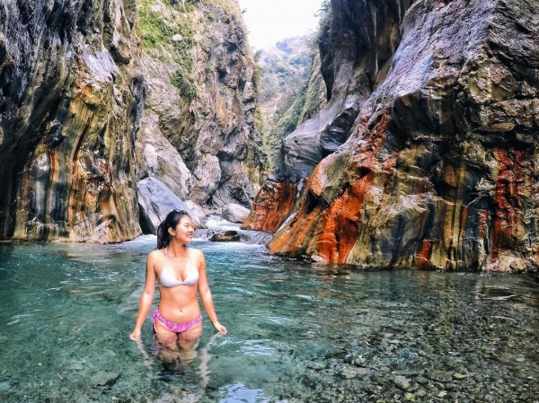 這個擁有七彩岩壁的絕美天然溫泉秘境,正是被譽為「雲豹之湯」的「哈尤溪溫泉」~除了超級壯觀的高聳七彩岩壁之外,還有著清澈見底的乾淨泉水~當地稱為這裡的溫泉為"黃金野溪溫泉",主要因為溫泉中含有豐富鐵質,顏色也偏黃,才得此美稱。至於這七彩岩壁,則是因泉脈自岩壁縫流出,而岩層富含各種礦物,經過經年累月的硫磺沖刷,才會將岩石染成紅、黑、黃、白等多種繽紛的色彩!