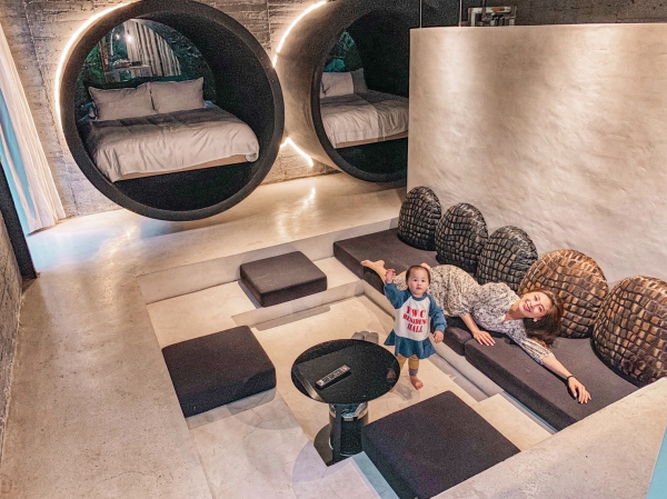 而如果是超過四人或是家庭旅遊的話,千望不要錯過這個水管房型,清水模做成的房間,看看這個水管屋的特殊設計,可以透過床頭的玻璃望向樹林,還有地陷式的小客廳,真的是好高級的享受呀~