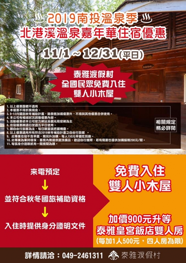 天氣漸漸轉涼,全台各地的溫泉旅遊區都紛紛祭出溫泉季優惠,位在南投國姓鄉的泰雅渡假村就配合南投的溫泉季活動,釋出超殺優惠!
