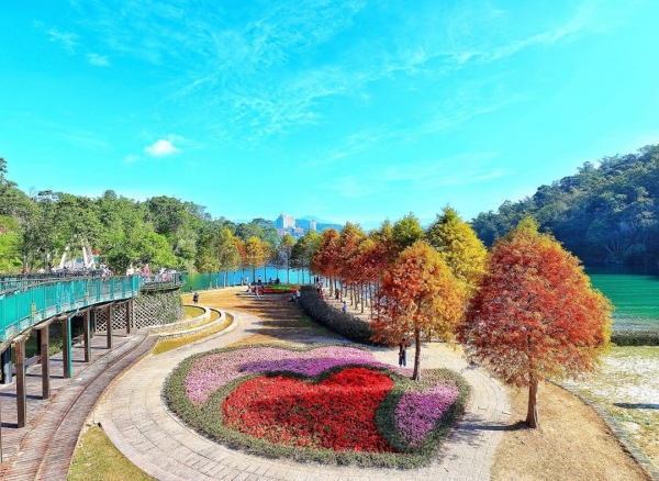 南投魚池近年來最夯的景點莫過於向山遊客中心~是日月潭周邊最高人氣的景點,不但有無邊際湖景、清水模建築之外,還有落羽松!現在正值秋冬季節,這位於湖畔第一排、景觀位置最好的落羽松可是超級夯~旁邊還有兩顆浪漫大愛心,搭配夢幻落羽松更是浪漫滿分~快趁現在去拍!