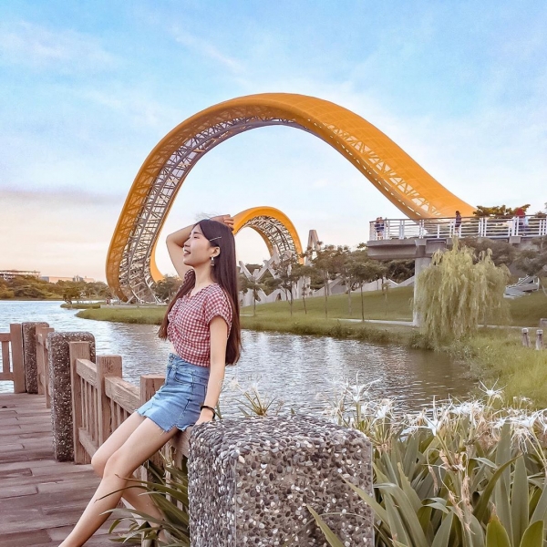 迎曦湖因為面向東方、看日出的角度很美~所以獲得這麼美麗的名字!在迎曦湖畔有一座相當吸精、顯眼的超大型鋼構公共藝術雕塑「舞彩迎賓」,長度跟一圈操場一樣長、高度有三層樓高!遠遠就能看到他在湖上耀動迎接你~