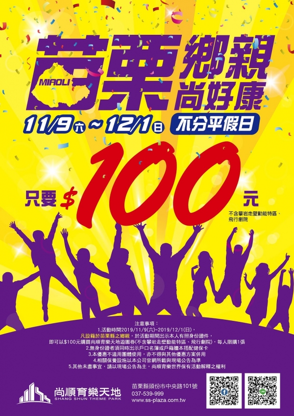 苗栗居民看過來!11/9(六)-12/1(日) 不分平假日,凡設籍於苗栗縣之鄉親,於活動期間出示本人有照身分證件,就可以購買$100元遊園券!
