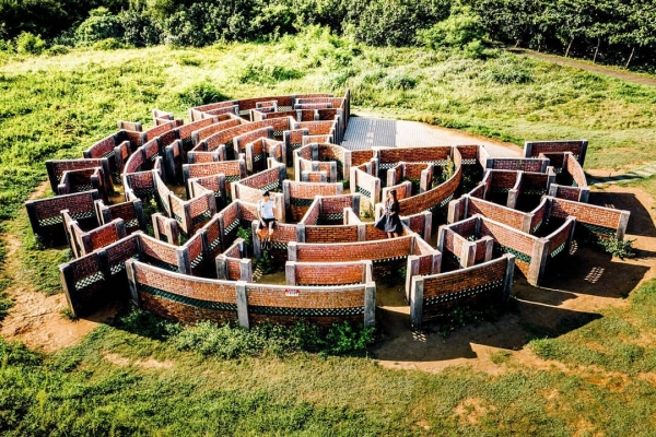 老梅迷宮以環狀圍繞的方式設計,是由許多紅色磚塊及綠色空心磚瓦相交堆疊而成的,就像中國特有的古城城牆,帶你走進歷史軌道。新奇的設計加上彎曲的走道,吸引了許多遊客前來玩樂拍照呢!