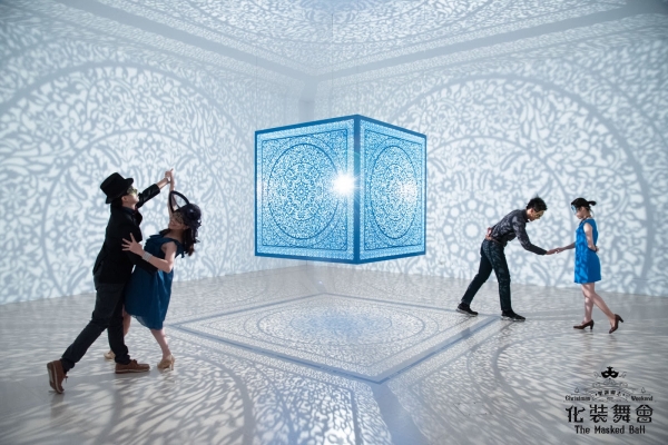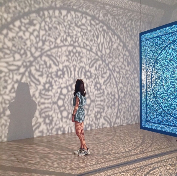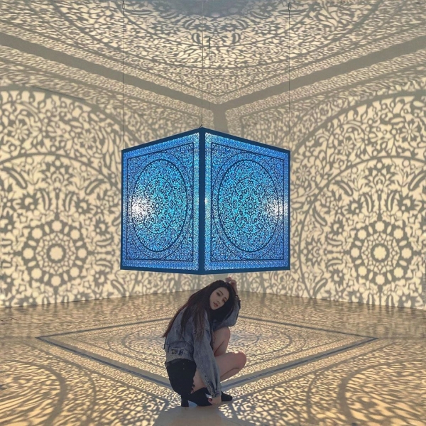 看看這些照片!是不是超級夢幻的,藍色的花雕立方體懸掛在房間中央,使用光線由中心向外投射到牆上,使房間充滿了精緻的伊斯蘭傳統圖騰。
