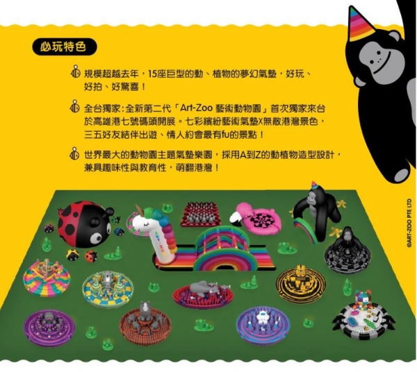 這次就是要介紹今年3月結束的ART-ZOO藝術動物園將在12/16在高雄港七號碼頭再次舉辦啦~為何又要再舉辦一次呢?因為這次規模更盛大,15座重新打造的巨型夢幻氣墊,還有無敵港灣景色可以欣賞,好玩、好拍、好驚喜!新資訊的講解以外,不如先來回憶一下3月都有哪些可愛的動物吧!