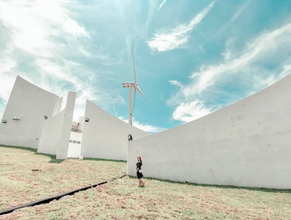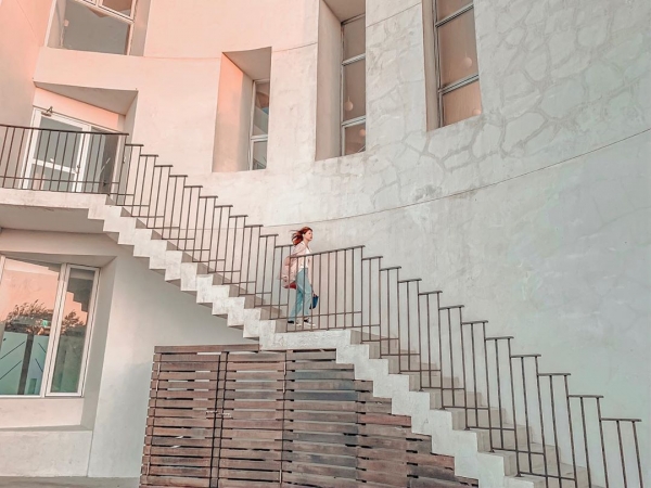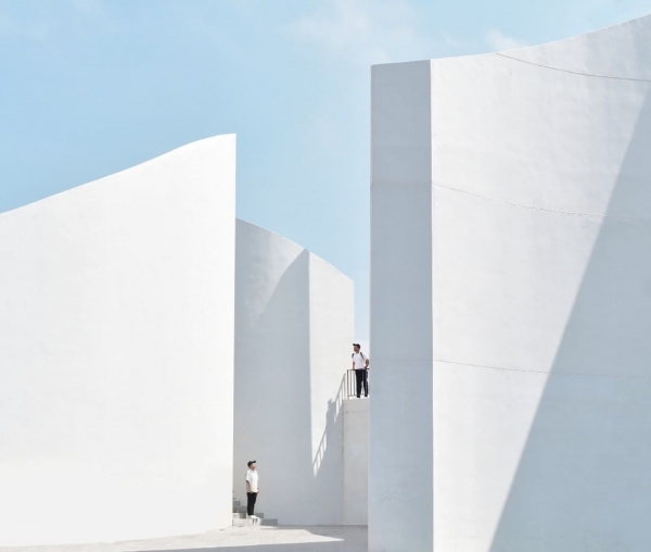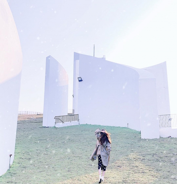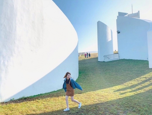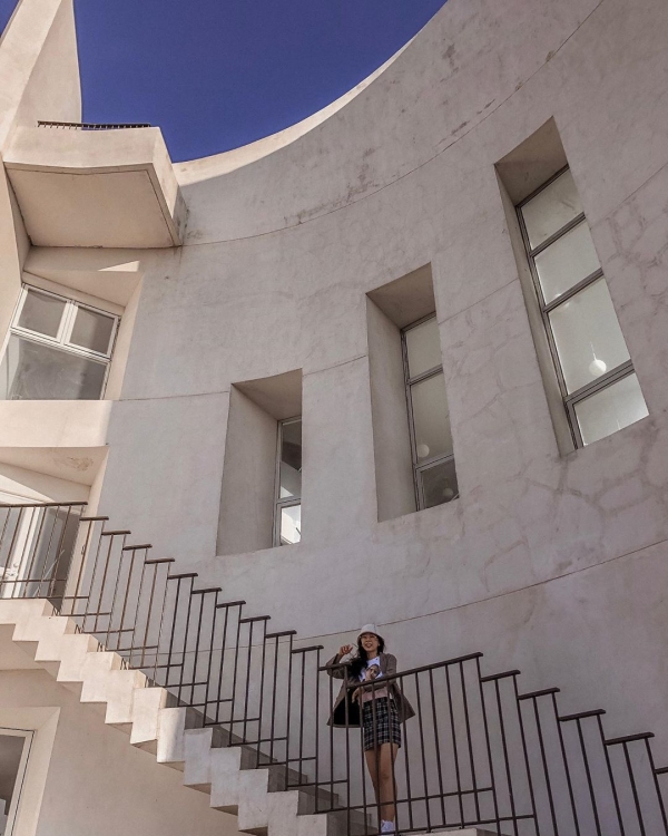 這邊每個地方都是取景地,好多婚紗照也都會來這裡拍,純白建築物各個都是彎曲的牆面,弧度的設計讓整體看起來更獨樹一格!除了白色牆壁十分醒目之外,在側面隱藏一個弧形的樓梯,它會直接通到二樓,陽光照射在欄杆上且灑落在階梯時的影子非常有氣氛,絕對會讓人失心瘋殺好多底片!