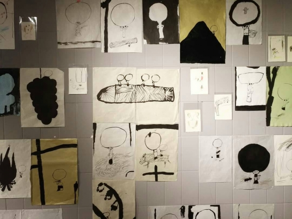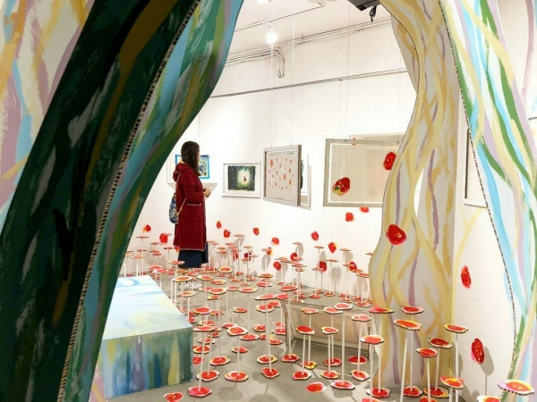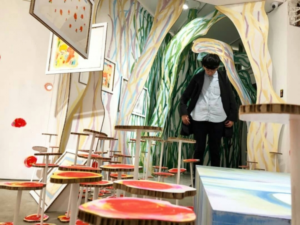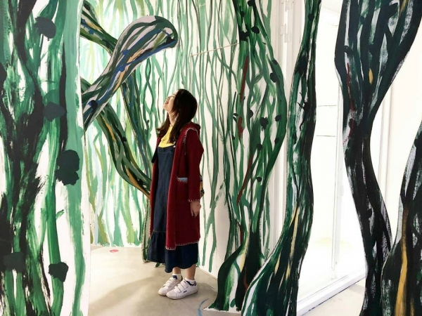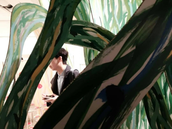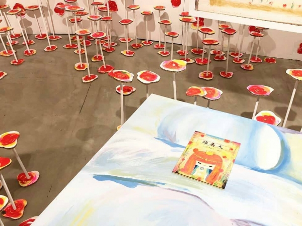 用紙板打造,不規則奔放的筆觸而成的荊棘後,藏著一張睡美人的床以及玫瑰花園,彷彿掉進的童話世界裡,格外可愛。不過個人覺得,有密集恐懼症的人,我們還是迅速經過就好。《天亮了,開窗囉》的原作也呈現在這裡,甚至還有大師的現場即席創作呢!錯過這次就不知道什麼時候能看到囉!