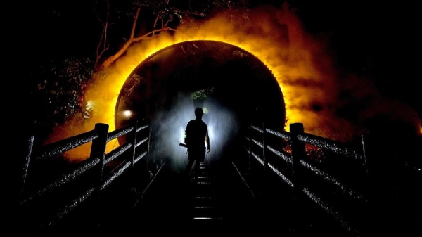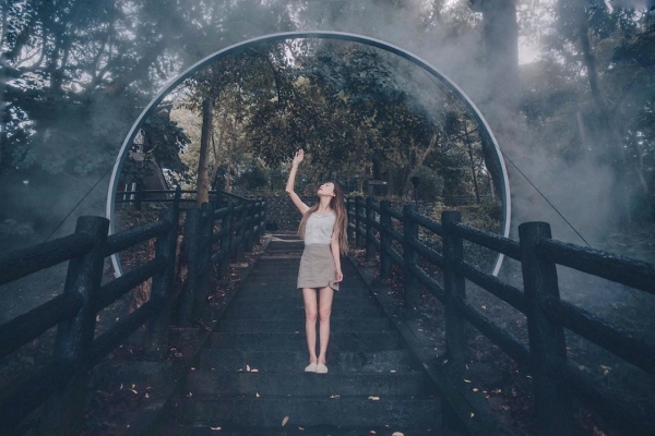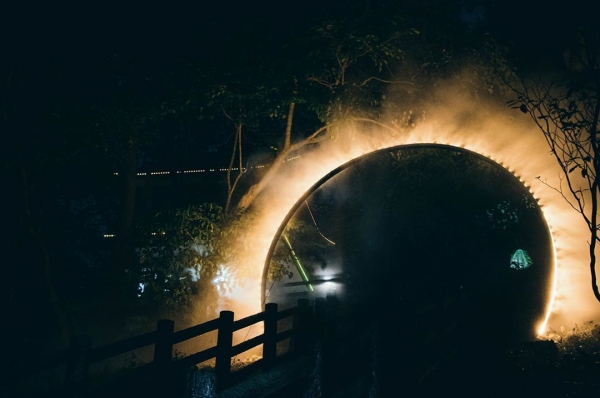 採用簡潔線條,光、水霧結合而成的裝置,森山中顯得格外神秘,自然與人們生活的真實世界中深入再發現奧妙,彷彿是一個隧道入口,路人得以穿梭於北埔小鎮的今昔時空當中。