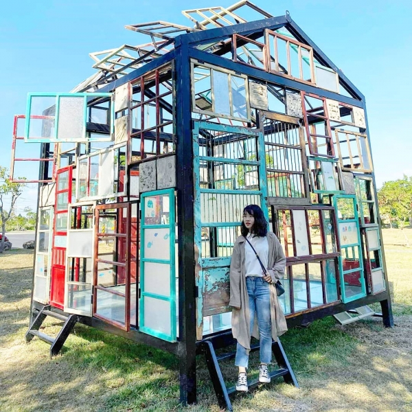 走到大平里集會所公園草地廣場上,你能發現以老屋大門、窗框、窗花及鐵窗等建構成的一個家屋《家的記憶風景》,中空的設計,在裡面能夠將土地與上方的天空一覽無遺。