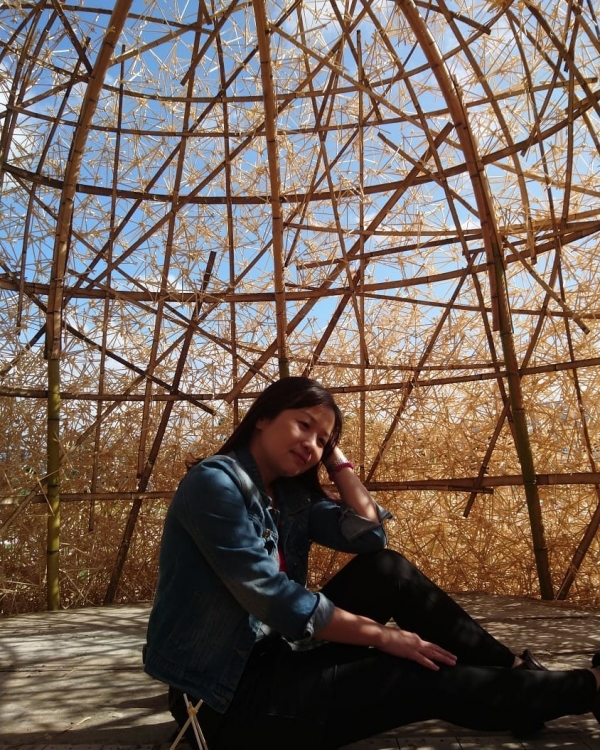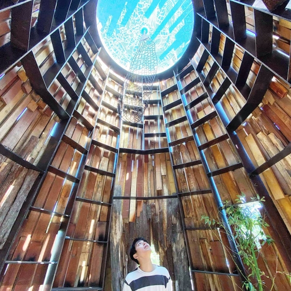以鋼板與樟木結合成如一株歷經滄桑的老樟樹,矗立在湖畔的小山丘上,進入巨大的樹幹之中,陽光灑落於頂部的鋼板年輪細縫,下方懸掛一羽蜻蜓翅膀,隨風搖曳著,而地面中央處擺放著一顆象徵伯公的溪石,溪石象徵土地,羽翼代表著天空,年輪則是時間的代言者。
