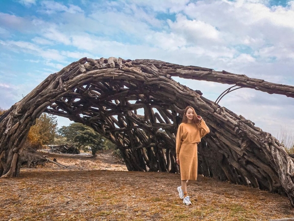 游文富創作的超吸睛打卡熱點,沙丘上雪一般的場景超美麗《坡白留青》,還有地景藝術家李蕢至打造的漂流木藝術廣場《加留沙浪》,每件沙丘地景藝術都各自成為一道彩虹獨具特色,也完美敘述了壯圍在地精神。