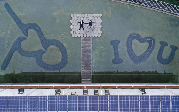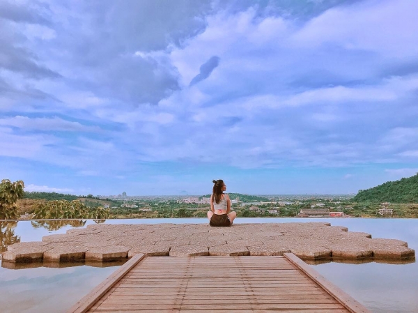 位在半山腰上的「龍座咖啡」,無邊際的景觀池,有著水上木棧步道與石頭堆疊出雙心石滬圖案與I love you的字樣,居高臨下就像在對情人告白,看著超寬景的宜蘭美景,整個人都陶醉了,開闊視野俯瞰蘭陽平原把最美的風景收入眼中。