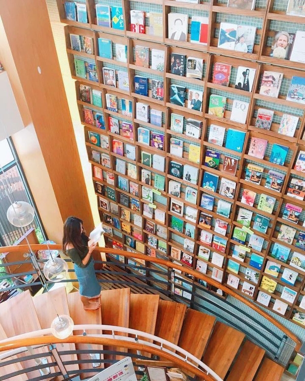 從一樓一職延伸到頂部的書牆,擺滿了書籍看起超壯觀~來這裡拍張照直接氣質爆表!就算不愛看書的人,也很難不被這麼美的地方給迷助吧!小文青必訪的烏日景點非這裡莫屬!
