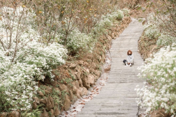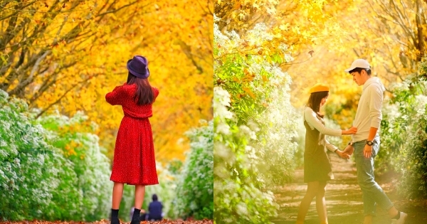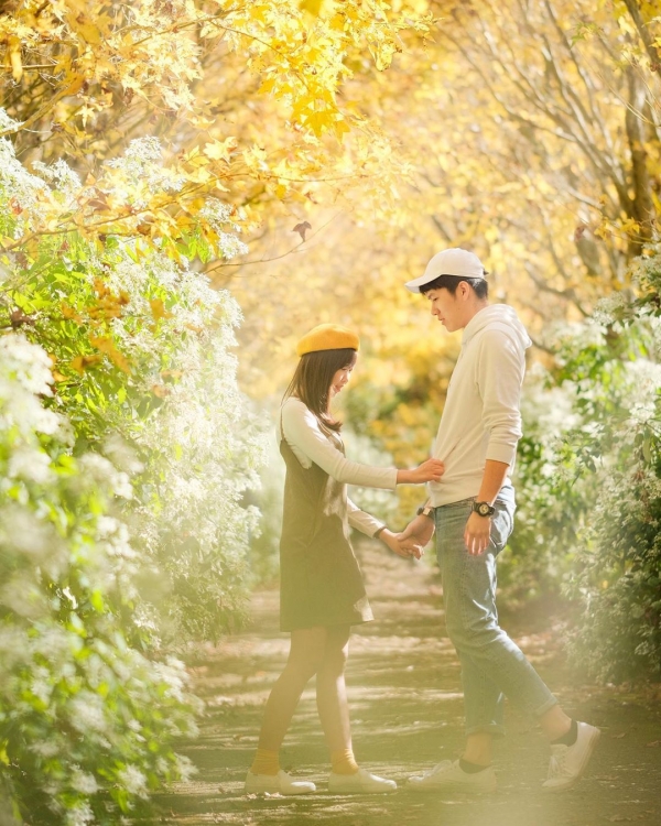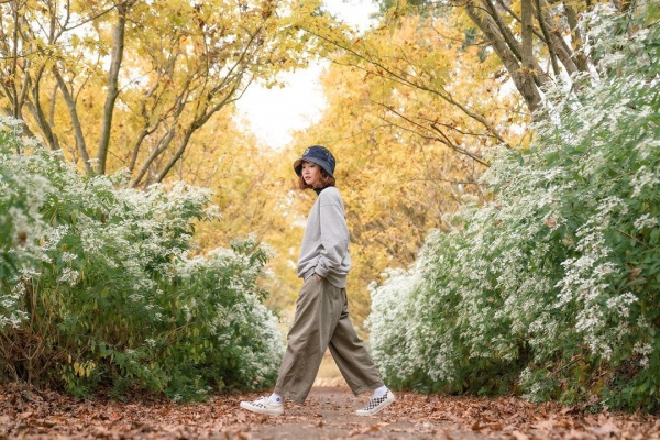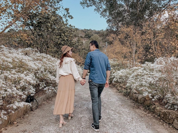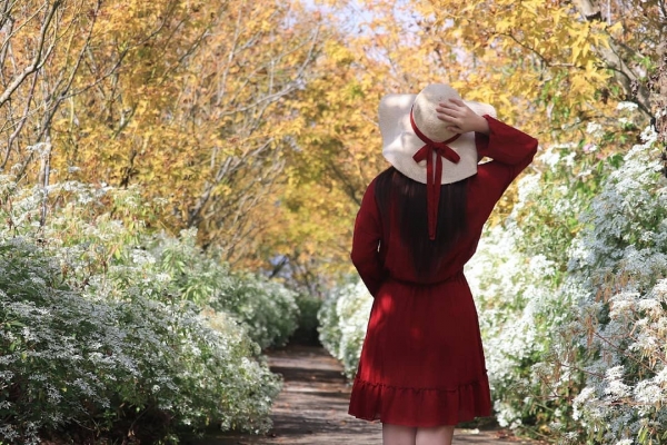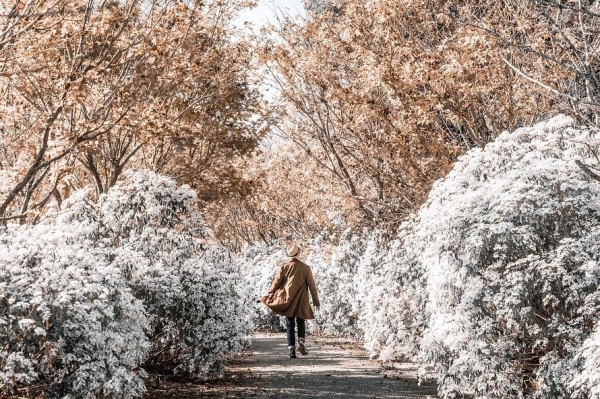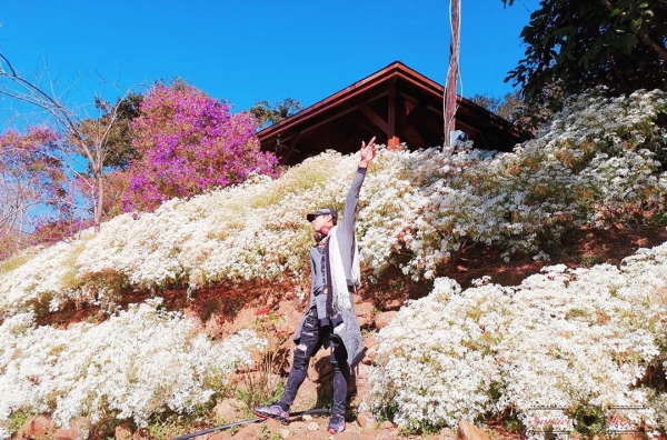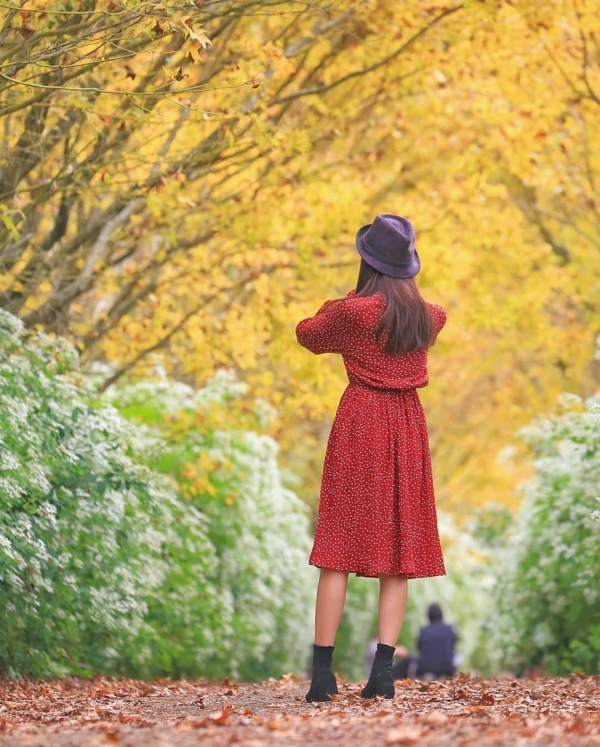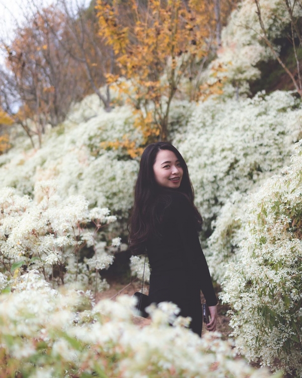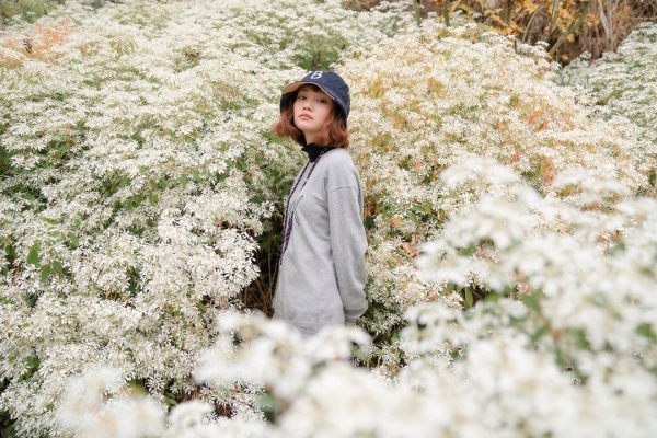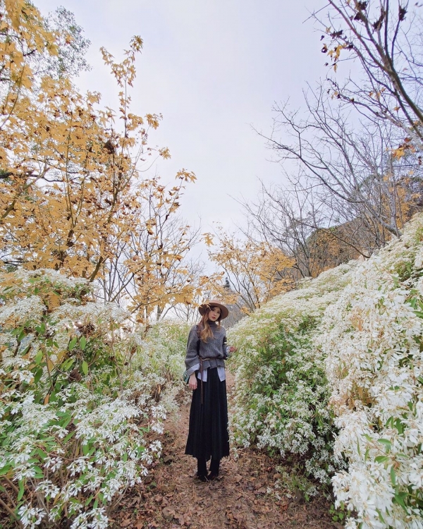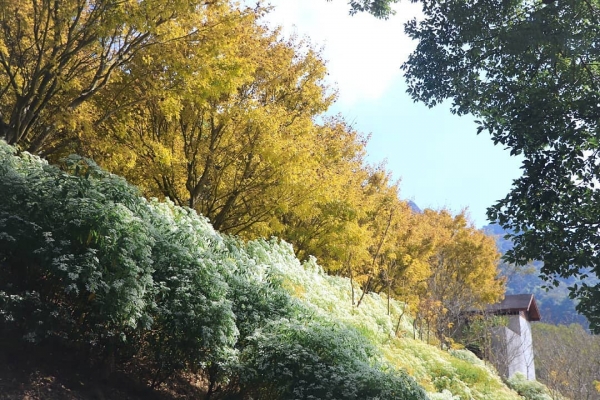 金黃色的楓葉,加上雪白一片的白雪木花海,真的非常迷人,讓你走也走不出這片浪漫聖地夢幻小徑,讓你拍個不停,所有風景相互輝映,色調陪襯超加分,拍照拍到相機電池沒電啦!