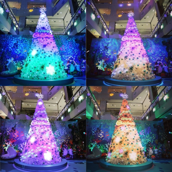 高達8米的超高珊瑚森林聖誕樹,不但會跟著不同的燈光做變化,超繽紛的聖誕樹上面還有小魚群與海星的LED裝飾,看起來就像真的在熱帶淺海!