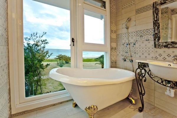 裡面還有個超夢幻浴缸可以泡澡!外面的玻璃是透明的,皆有安裝遮光簾子,直接能與戶外風景對應,但是洗澡時記得拉下來唷,不然會被看光光!