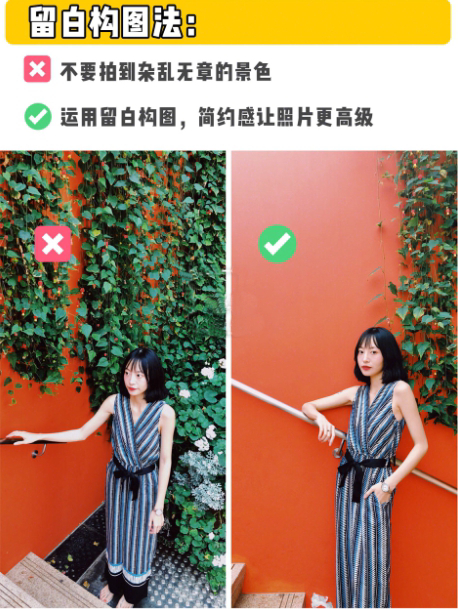 旅拍時不要為了拍到身後的景色而導致拍出的畫面雜亂無章。運用留白構圖的方式,找到乾淨的背景,留出空隙,拍出簡潔感,讓照片顯得更高級。