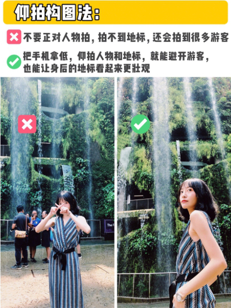 不要直接正對人物拍照,不僅拍不到地標風貌,還會拍到很多遊客。把手機拿低,仰拍人物和地標,就不會拍到遊客,也能讓身後的地標看起來更壯觀,人物更有氣質喔!這個構圖法很適合在人多的觀光風景區使用。