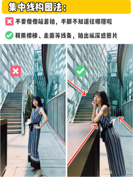 不要傻傻站著拍,手腳不知道往哪裡擺。利用身邊的樓梯、走道、扶手等線條,找到可以連成直線的角度,就可以拍出縱深感的照片囉!