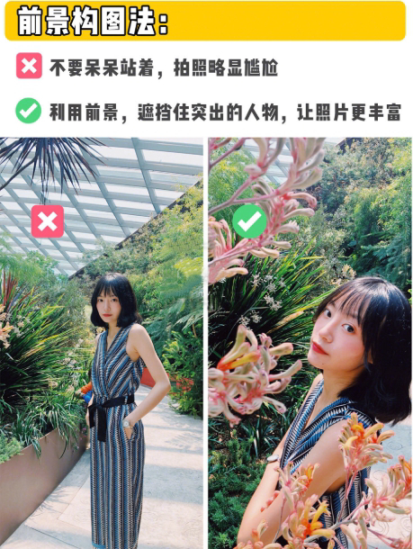 不要呆呆站著,拍照會略顯尷尬而且畫面會比較單調。利用前景,前景可以是花草或是建築物,可以稍微遮擋住突出的人物,讓照片看起來更豐富。