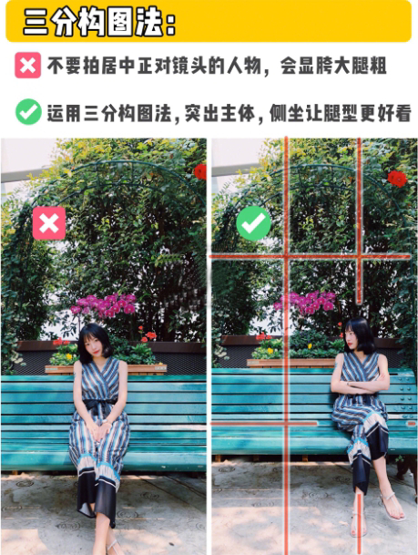 不要讓人物正對鏡頭坐中間,否則會拍出很粗的大腿。利用三分構圖法,左三分、右三分都可以,讓照片喘口氣,看起來更舒服,人物稍微側坐讓腿型看起來更好看喔!