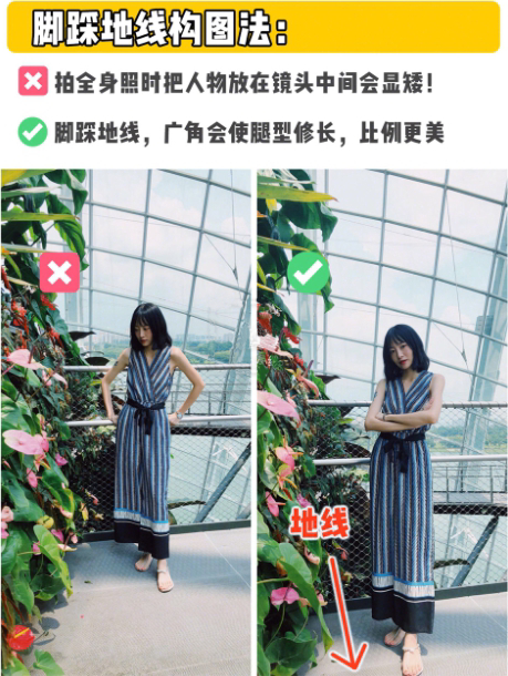 拍全身照時,不要把人物放在鏡頭中間,這樣特別顯矮,要把腳放在相框取景的最底部,稍稍有先廣角會讓腿型修長,比例更漂亮。