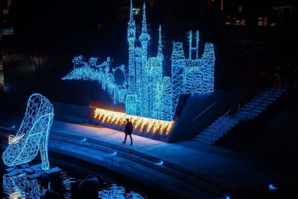 柳川這邊則是用燈泡打造出一座座夢幻場景,6位迪士尼公主、13個造型燈飾都超級浪漫~彷彿走進童話中的奇幻世界般!耶誕燈節從12月6日一直到明年元旦,迪士尼的經典動畫角色將出現在街頭,不僅能拍照打卡,還有燈光秀與音樂演出。
