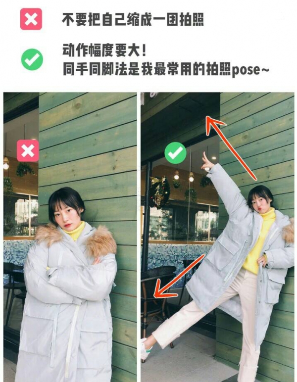 不要把自己縮成一團拍照,動作幅度要大,同手同腳拍起來也會很可愛,大動作超上鏡!