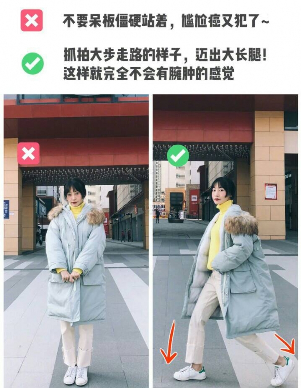 不要呆板僵硬的站著,手腳不知道怎麼擺,尷尬症又出現了。可以抓拍走路的樣子,邁出大長腿,這樣的照片動感又自然,也完全不會影臃腫的感覺。