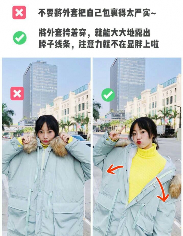 不要將外套把自己包得緊緊的,不穿好成為現在很流行的穿法,露出脖子線條,即使是高領,也能有個V字形線條和色彩的對比,注意力就不會放在顯胖上啦~