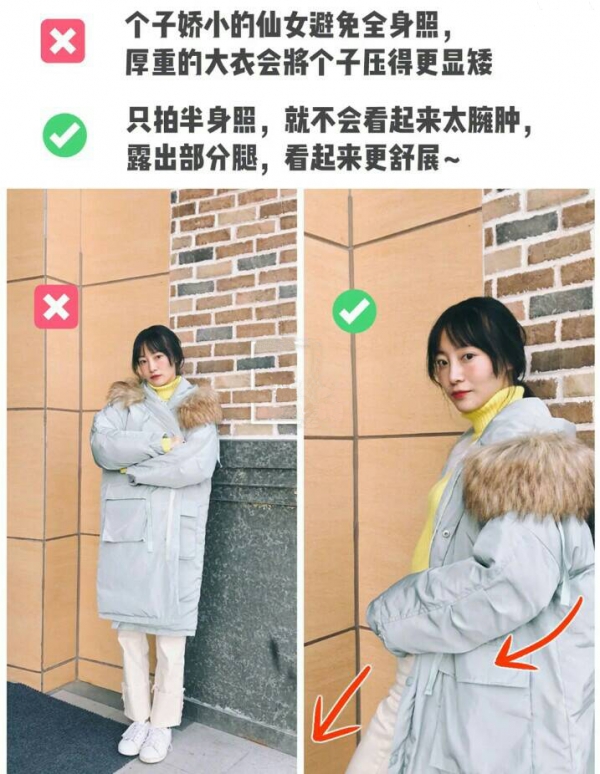 個子嬌小的女孩盡量避免全身照,因為厚重長版的大衣會讓個子顯得更矮,只拍半身,就不會看起來太臃腫,側身正面都OK,如果露出部分腿,看起來會更伸展喔!