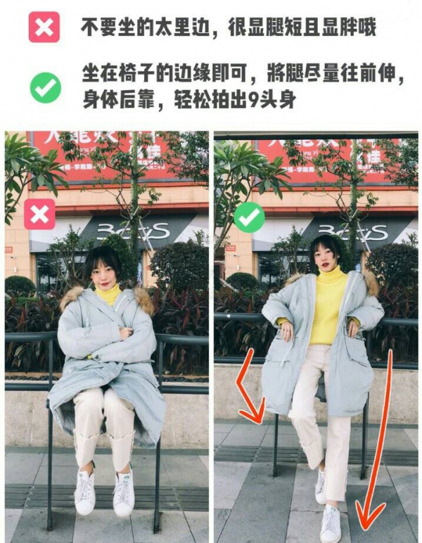 不要把整張椅子坐滿,會很顯腿短也顯胖!坐在椅子的邊緣即可,將腿盡量往鏡頭前伸,身體往後靠,拍出9頭身絕對沒問題!