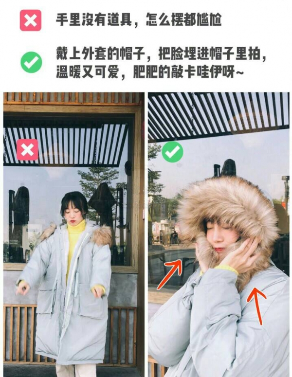 手裡沒有道具,怎麼擺都很尷尬?沒關係,那就戴上帽子,把臉埋進帽子裡拍,溫暖又可愛。
