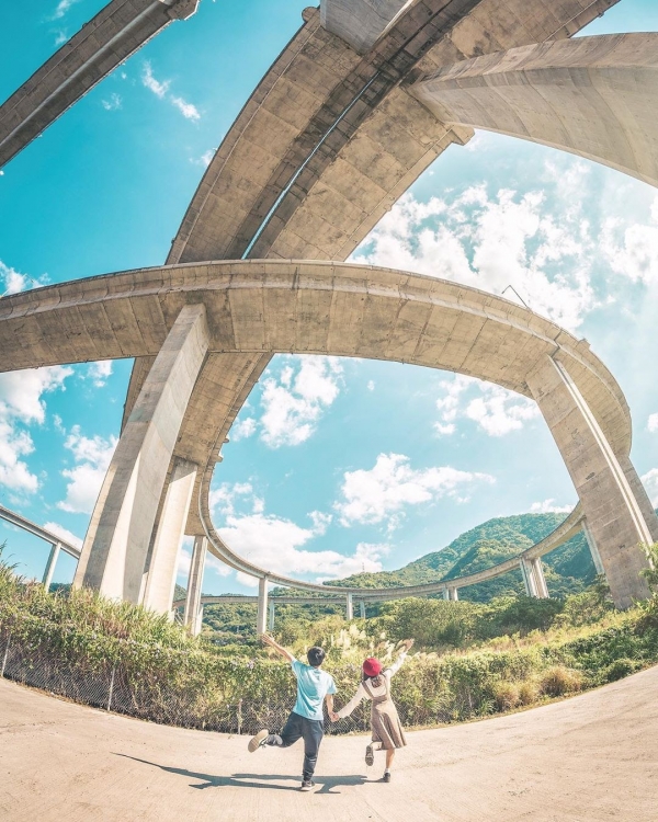 以23層樓全台最「橋聳雲天」,橋面距地面高達70公尺,特殊迴旋設計,博得「雲端公路」美名,更是全台高速公路八景之首。