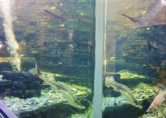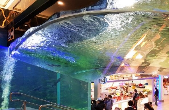 清水服務區不只外部用心打造,連裡面都有最矚目的天空海水市場,這是一個超大的水族箱,往餐廳裡面也都是同樣風格的設計,用餐區還有小水族箱,裡面養了超大的鱘龍魚、鯊魚,非常吸引人目光!