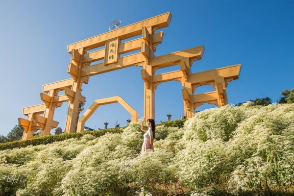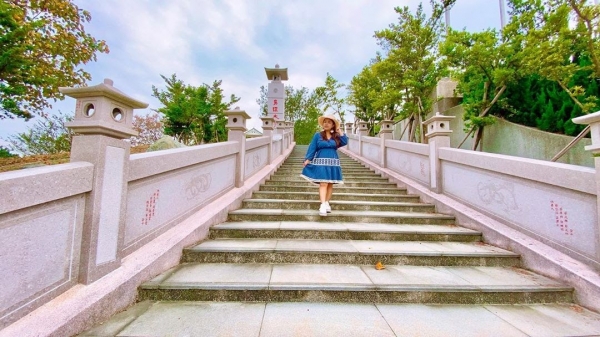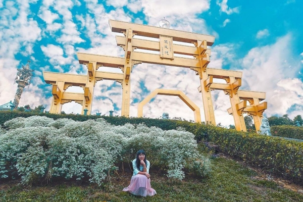 滿目的花草包圍有夠幸福,還能一起照到後面的佛寺。