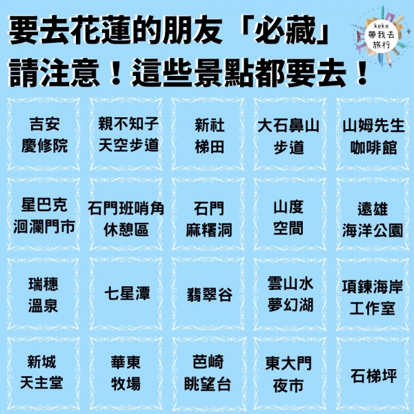 另外不想整天都待在飯店,花蓮還有很多超好玩景點可以去喔!這些你都去過了嗎?趕快安排一下吧~