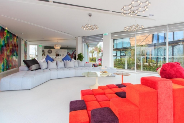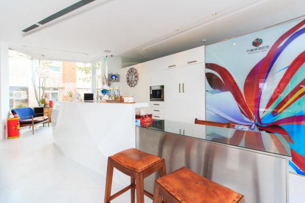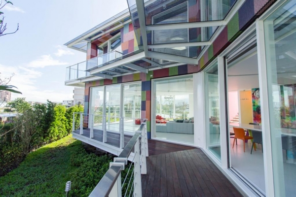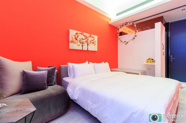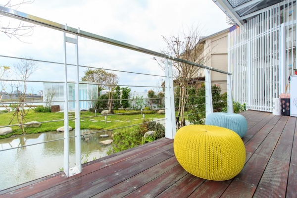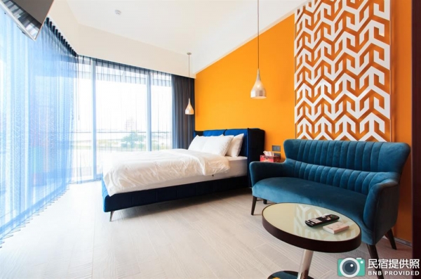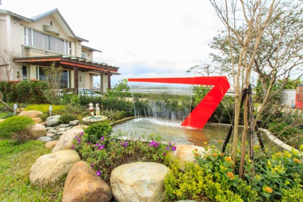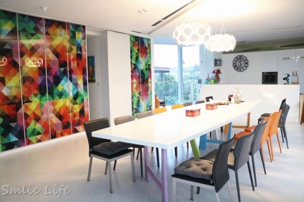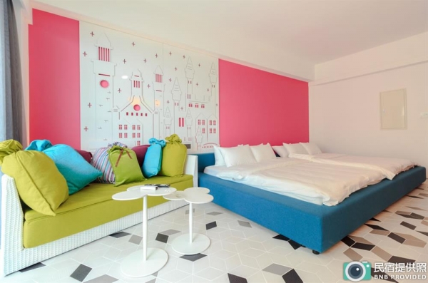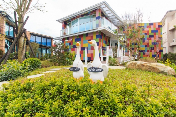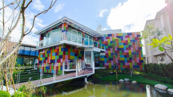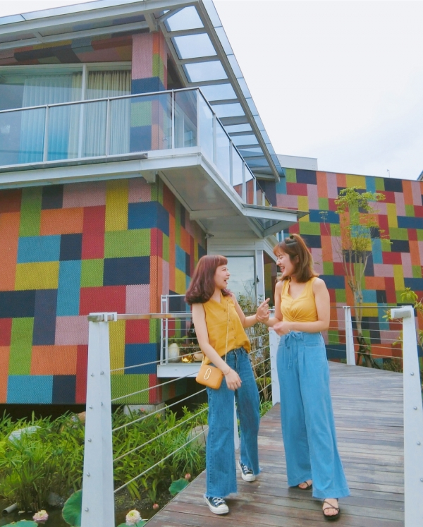 由五彩繽紛所組合成的色塊牆,用色非常大膽搶眼,就像調色盤般被色彩療癒了!除了提供超大停車區之外,還有偌大庭園、水池等等,給人愜意悠靜的住宿環境。