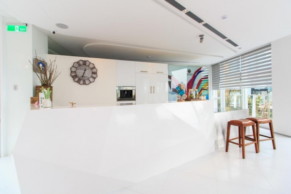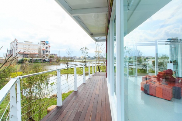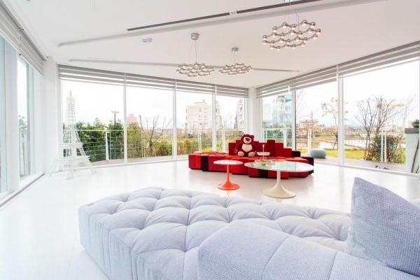 倚立在綠油油的田邊,非常醒目搶眼!一走進大廳,裡面空間非常寬敞,以純白為設計且利用大量的玻璃落地窗引進自然光,呈現了精緻的現代風室內裝潢。