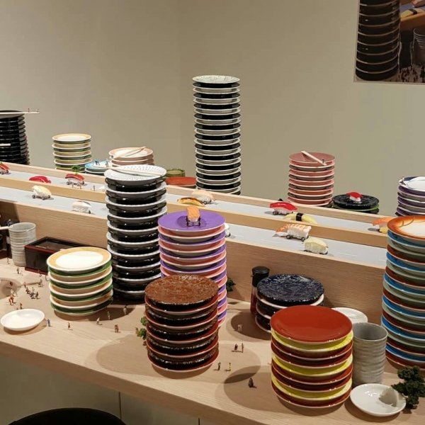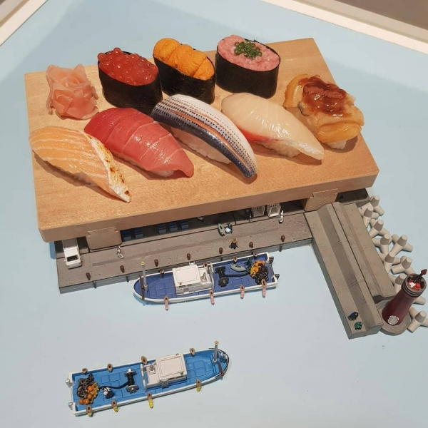 微型展1.0展覽一出就受到大家的喜愛,小編自己也是手機快門按個不停,處處都充滿小驚喜,是個看完會覺得很幸福療癒的展。去年大型作品是麵包列車以及車站,今年的則是首度公開亮相的放大版動態迴轉壽司高速公路,常吃的握壽司變成一台一台的車子,穿梭在公路上,真的超可愛的~