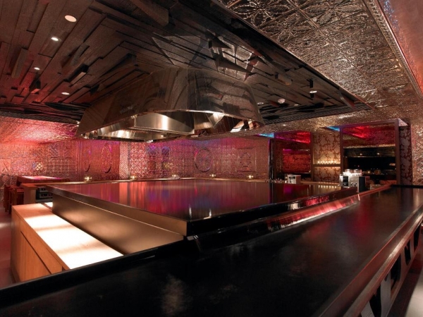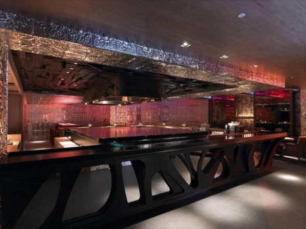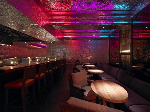櫃台後方就是絕美的超大型的水景吧台,倒映著彩色絢爛的燈光,牆面與天花板還是金屬壓花,後方其實就是平時也有開放營業的333餐廳喔!