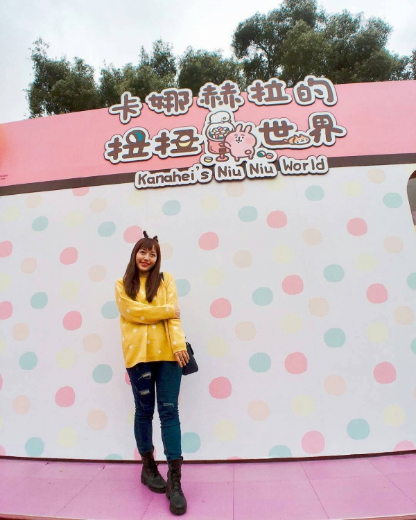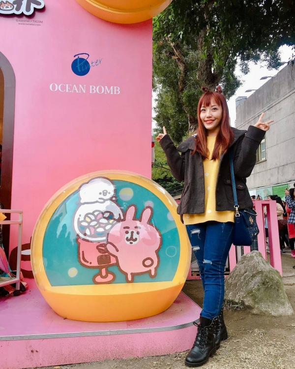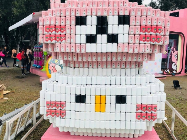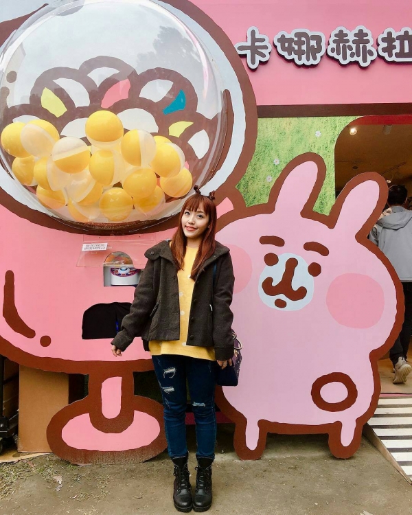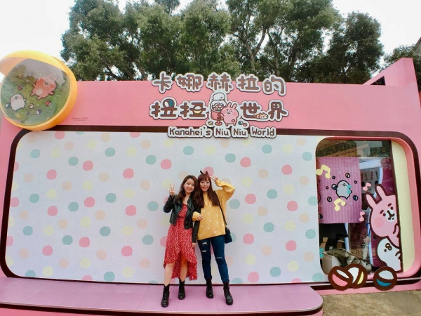 遠遠就可以看見樹下草皮上一個粉色的方形建築,入口旁兔兔跟P助抱著一台巨大扭蛋機,別以為是裝飾,是認真可以扭的喔!建議大家多換點50元去這樣就不用在滿滿的人潮中還要浪費時間換錢啦~