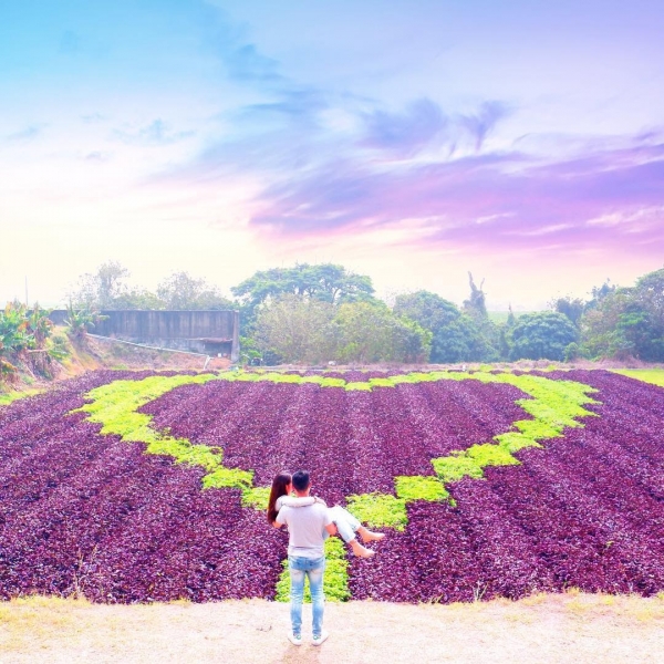 位在彰化竹塘鄉的「田在芯頭」是全台第一座的「地瓜葉愛心田」,園區主人以紫色與綠色地瓜葉為主題規劃種植出愛心模樣的菜田。
