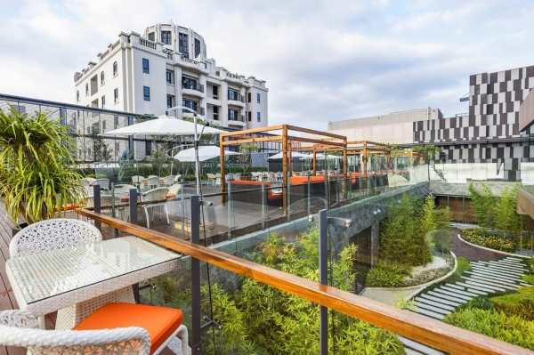 那頂樓不只有泳池哦,也有種植一些植物以及裝置藝術品,還有許多桌椅可以休息。