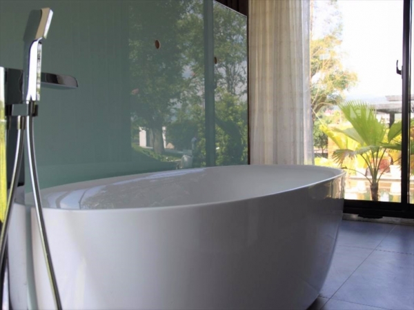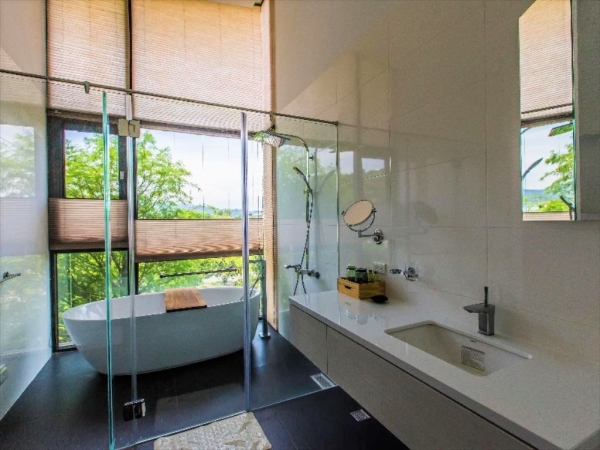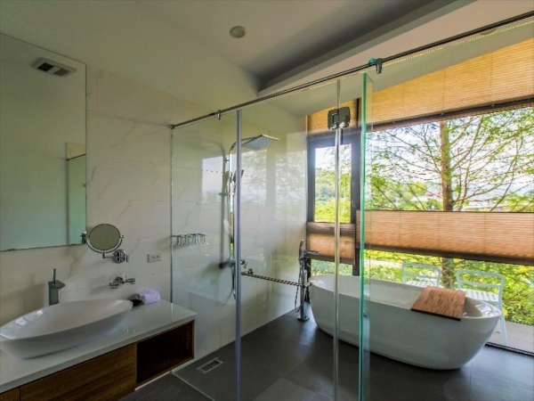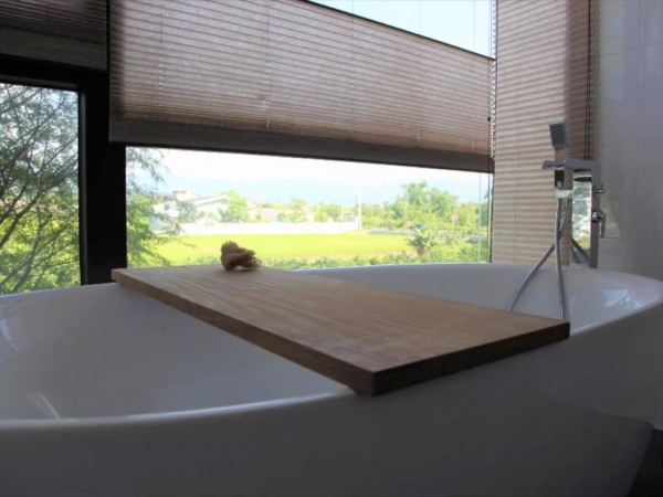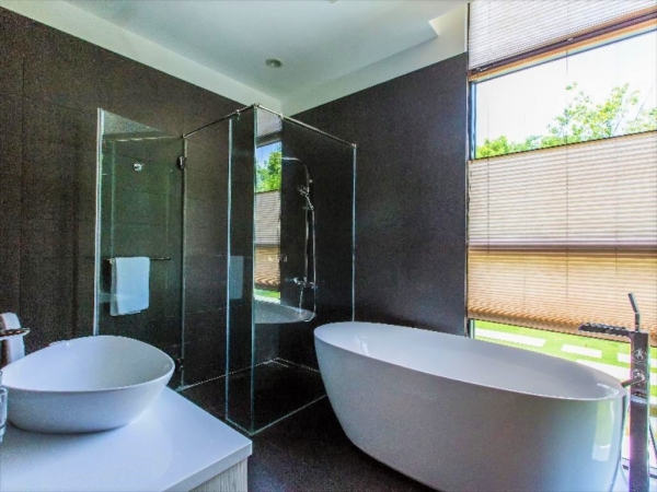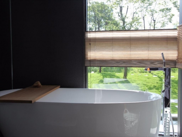 業者還使用簡約、舒適的蛋型浴缸,旁邊就是落地玻璃窗,讓大家可以邊泡澡邊享受窗外的風景,實在是非常舒適呀~