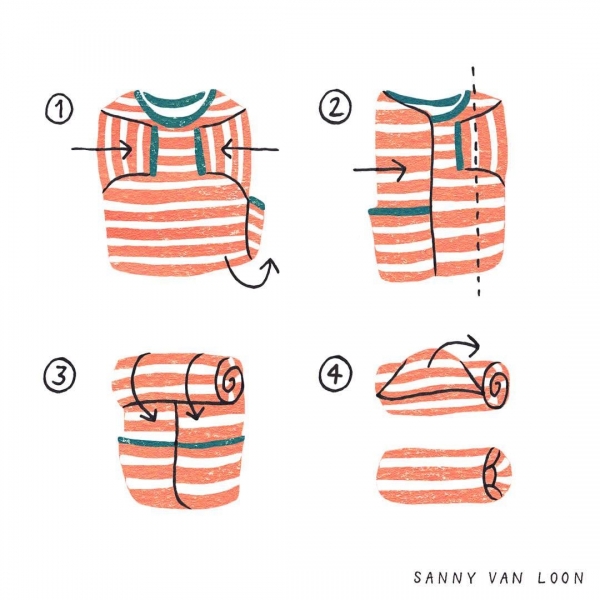 把衣服好像「捲壽司」一樣,先將衣服對摺,再由衣領捲至衣尾捲起來,這樣可以節省更多的空間,盡量捲得紮實一點,這招再搭配收納袋分裝,東西不但更好找,收納空間也就更多啦。