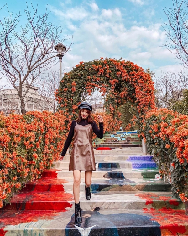 在繽紛彩繪的階梯旁開了滿滿的炮仗花,站在步道上怎麼拍照都美啦!這邊絕對是ig最夯打卡景點之一!