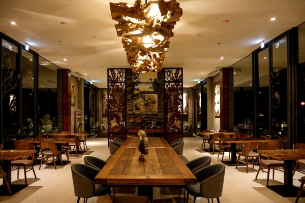 最吸睛的就是裡面擺放的藝術品,不管是掛畫還是其他圖騰石雕,每一件都超有質感且富有意義,另外還創意的利用老柚木樹根組合置入燈泡,做成一座大型獨特的主燈,這也是餐廳最大亮點之一!